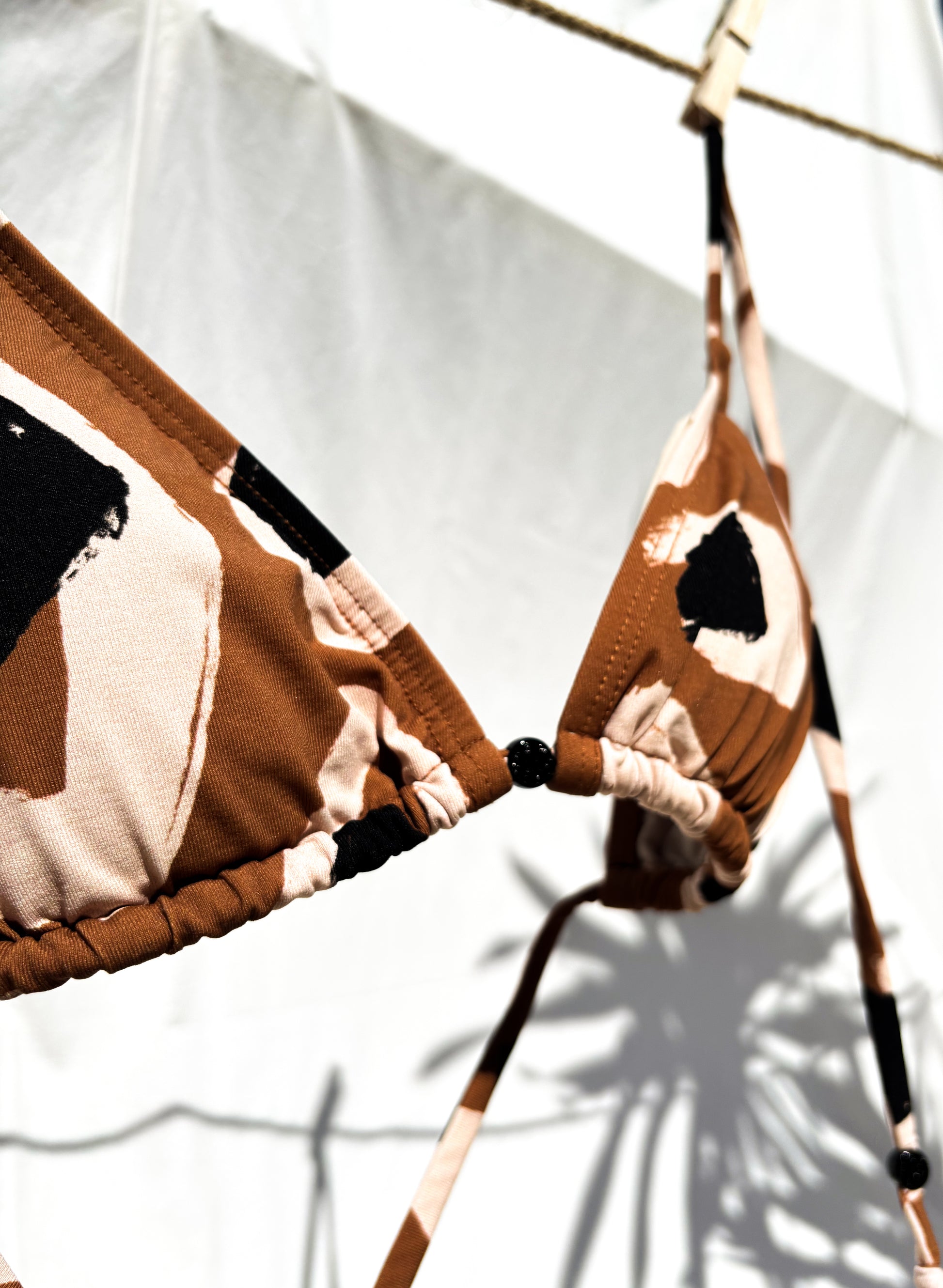 O top do biquíni é no modelo cortininha (triangular), de amarrar no pescoço. Opção de bojo removível.