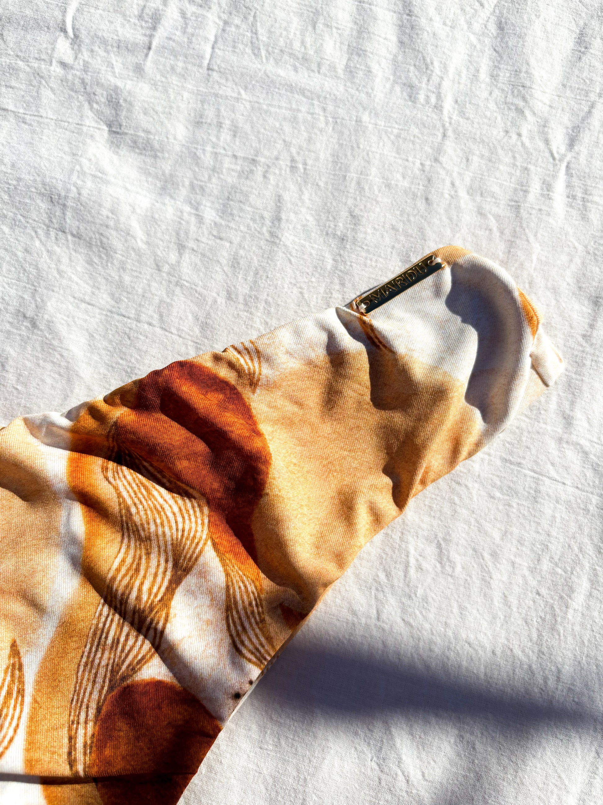 O tecido é Fluity (um tecido tecnológico e sustentável), que garante um toque “geladinho”, extra macio e próprio para os dias de sol com proteção UV 50+.
