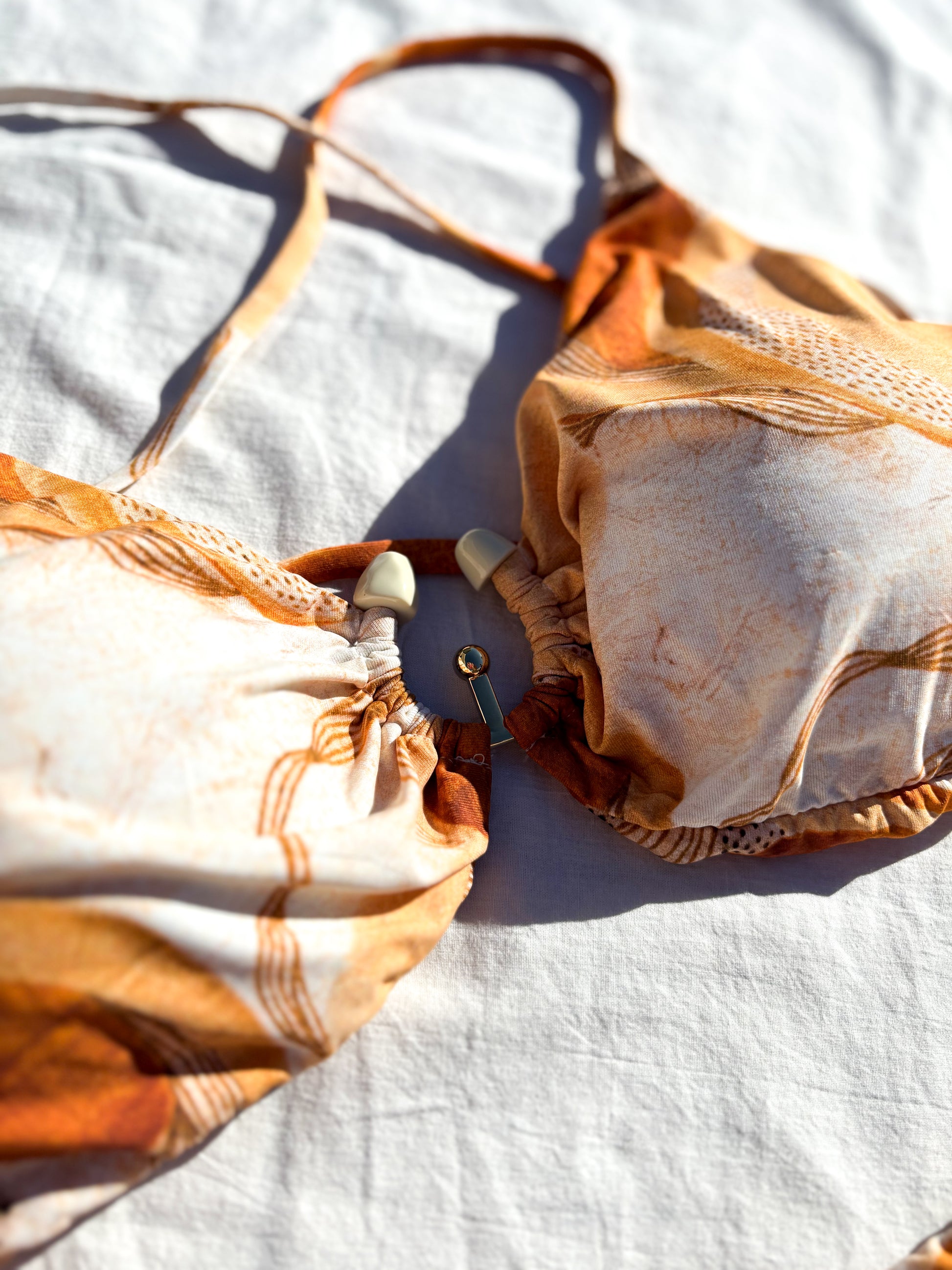 O top do biquíni com destaque na aplicação frontal feito de resina e metal banhado a outro de 18K. Este modelo tem maior cobertura e segurança, com laterais maiores e altura extra, oferece suporte ideal para seios grandes. As alças cruzam nas costas permitindo ajuste personalizado.