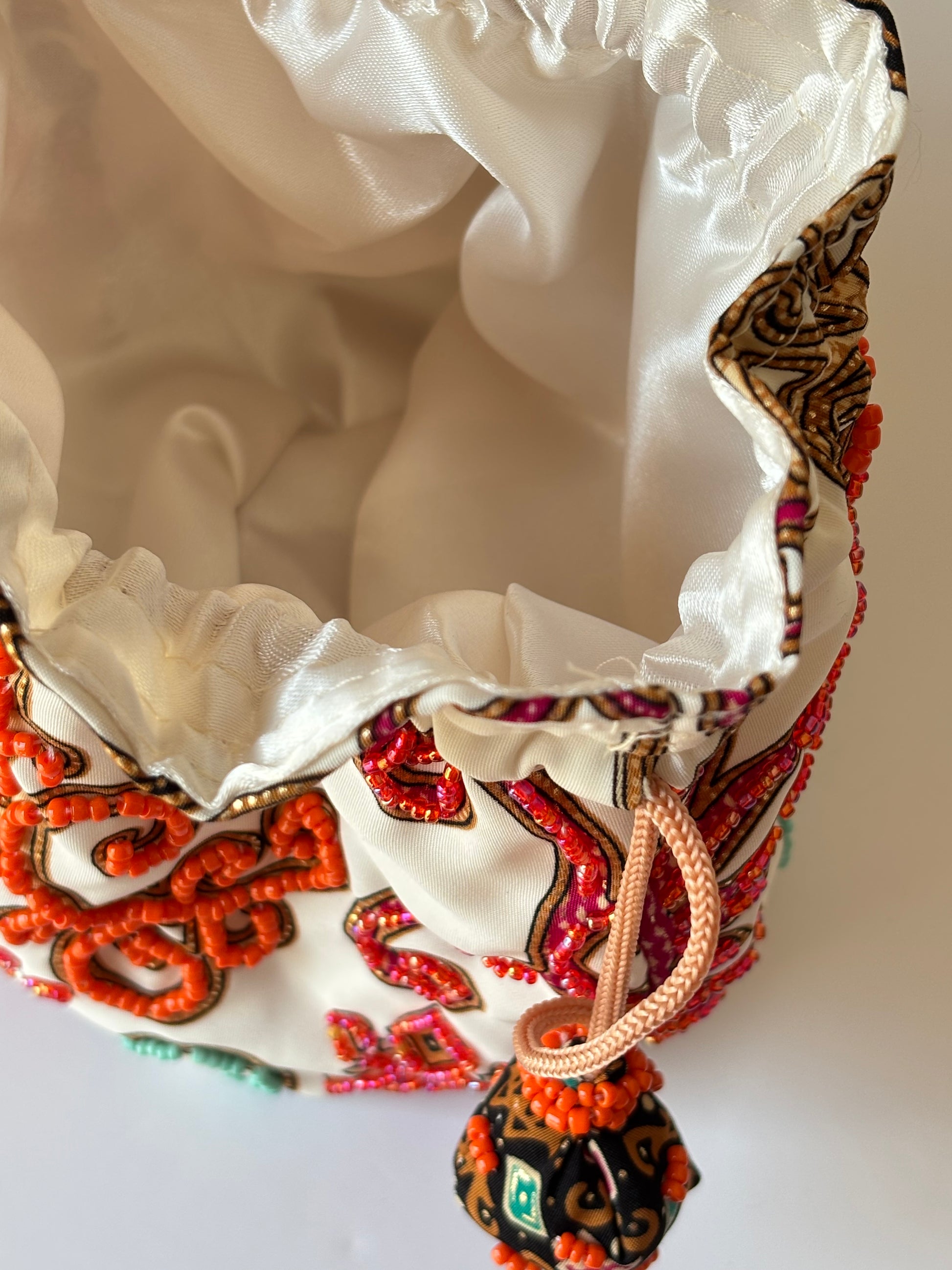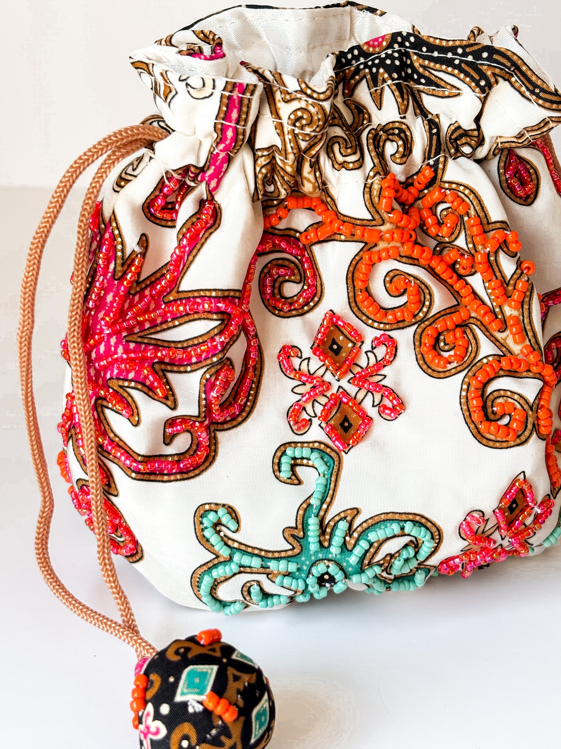 Bolsa de mão, bordada com missangas em tecidos com padrões tipicamente balineses