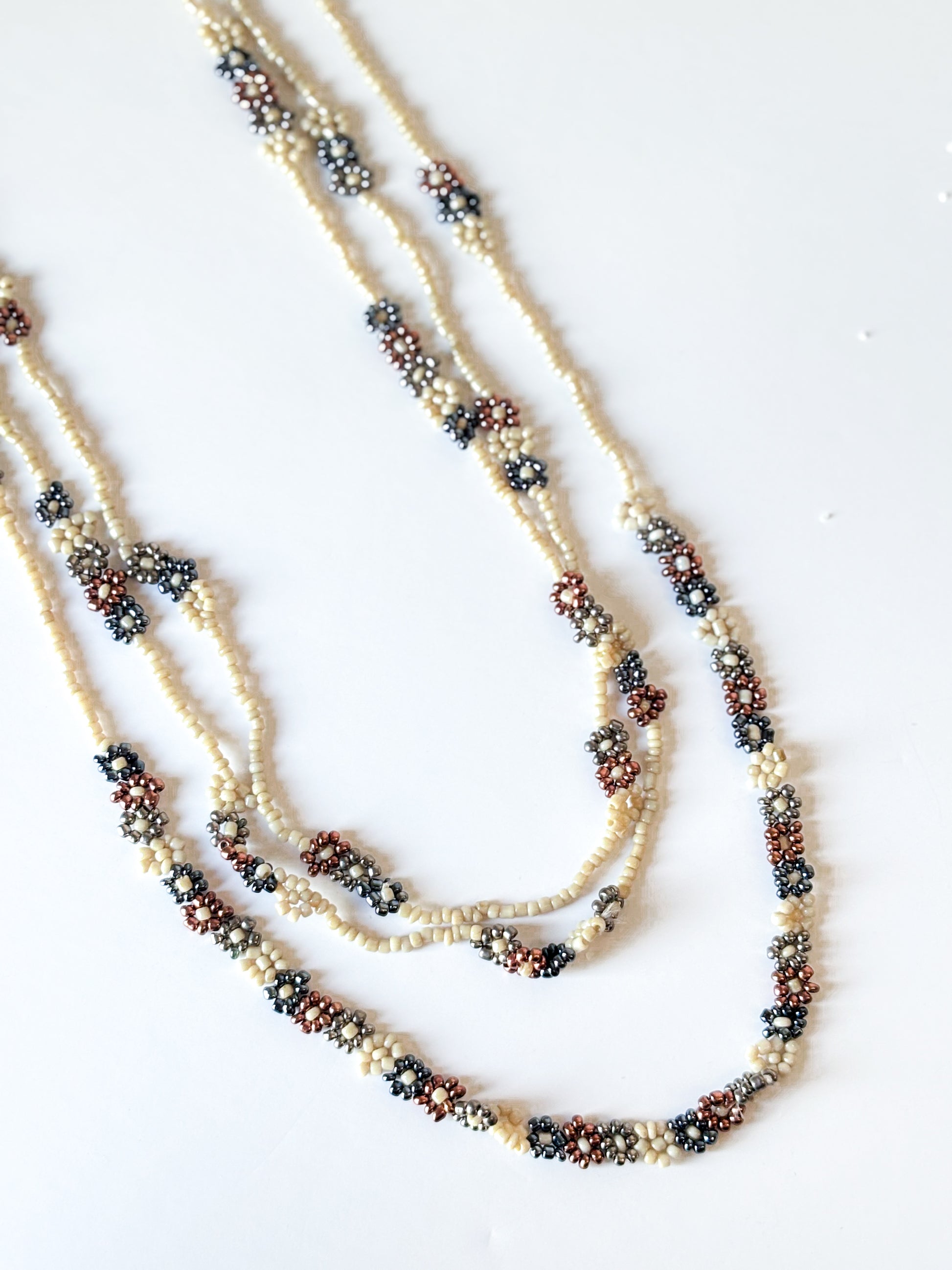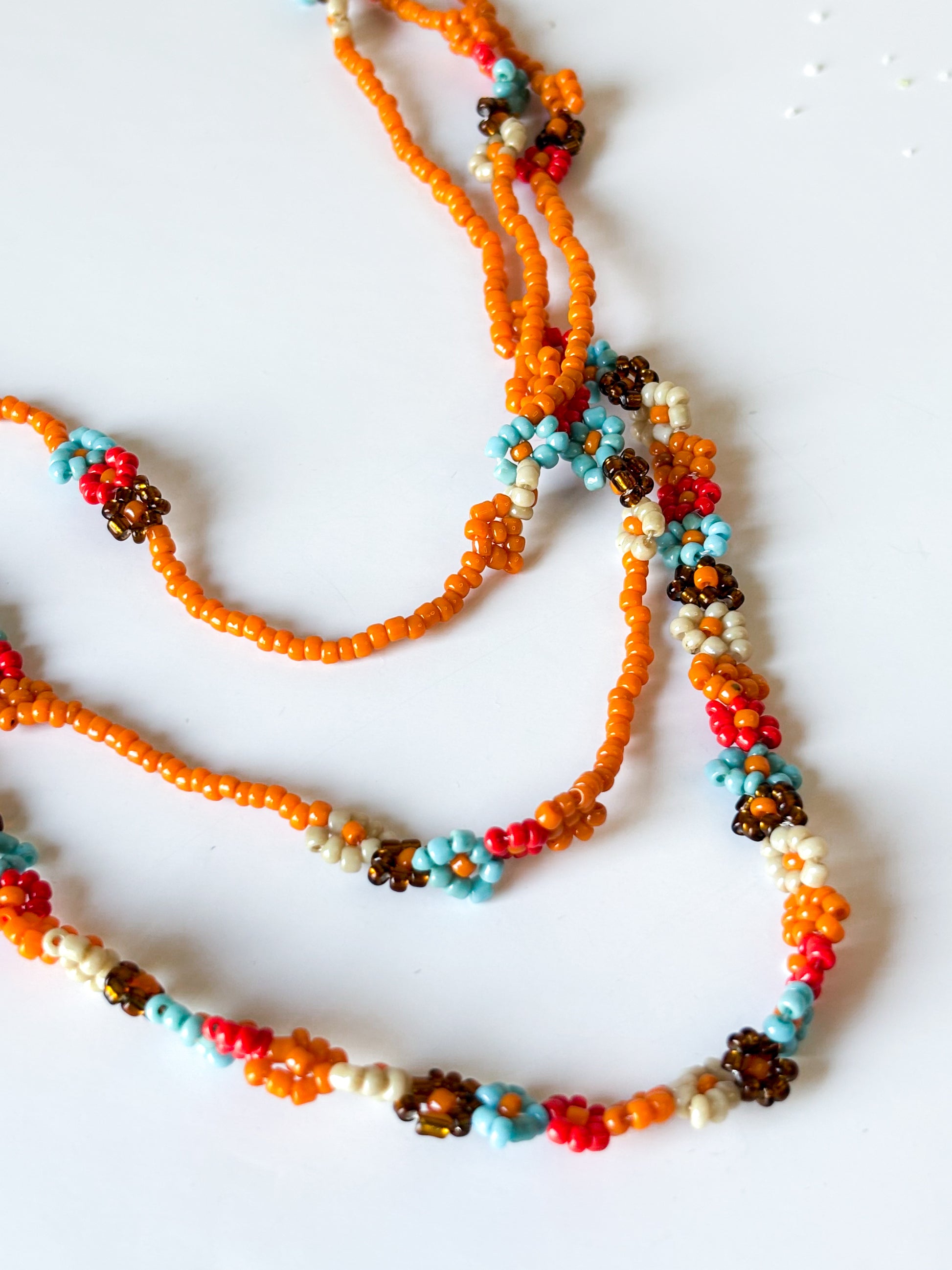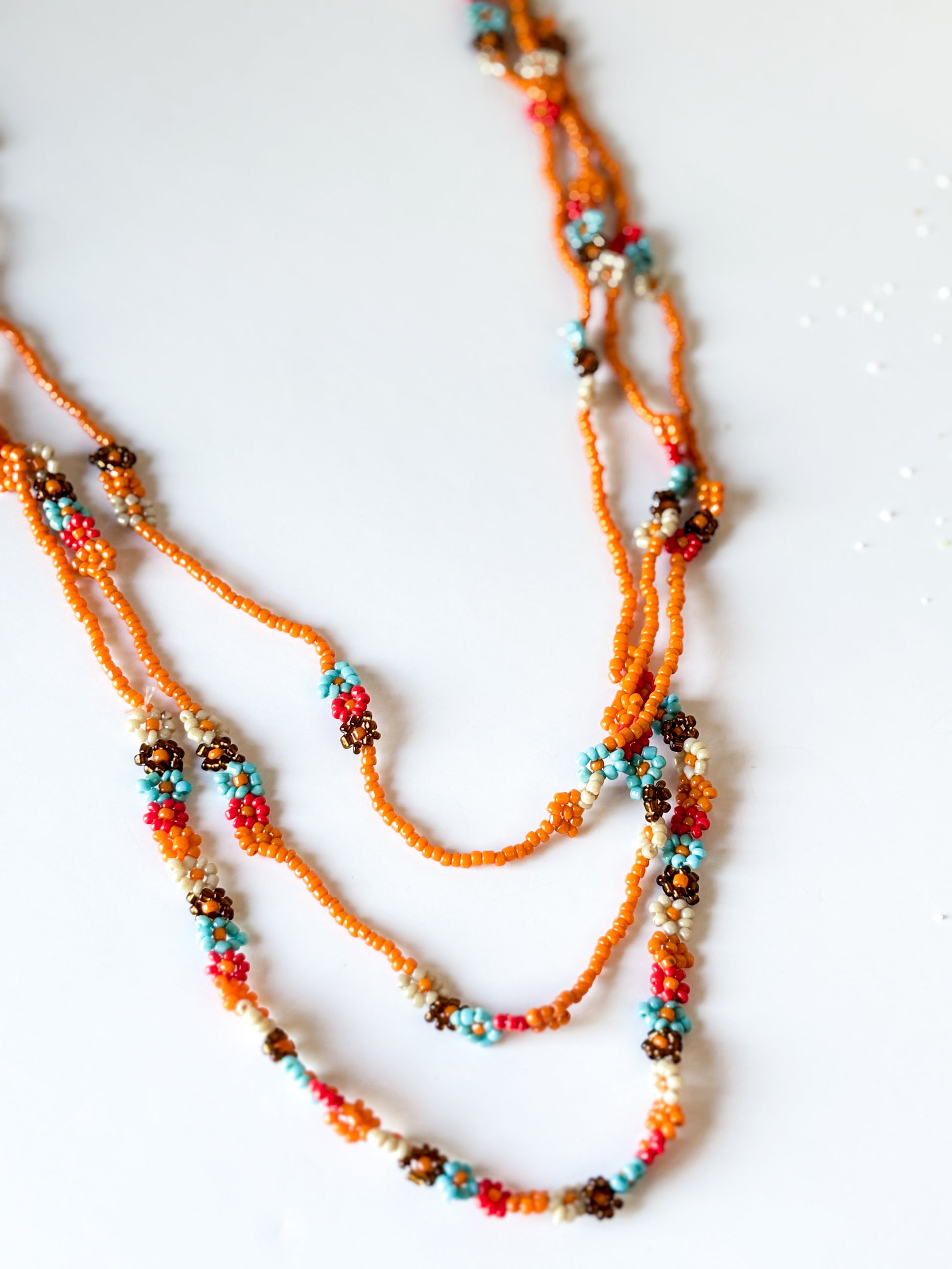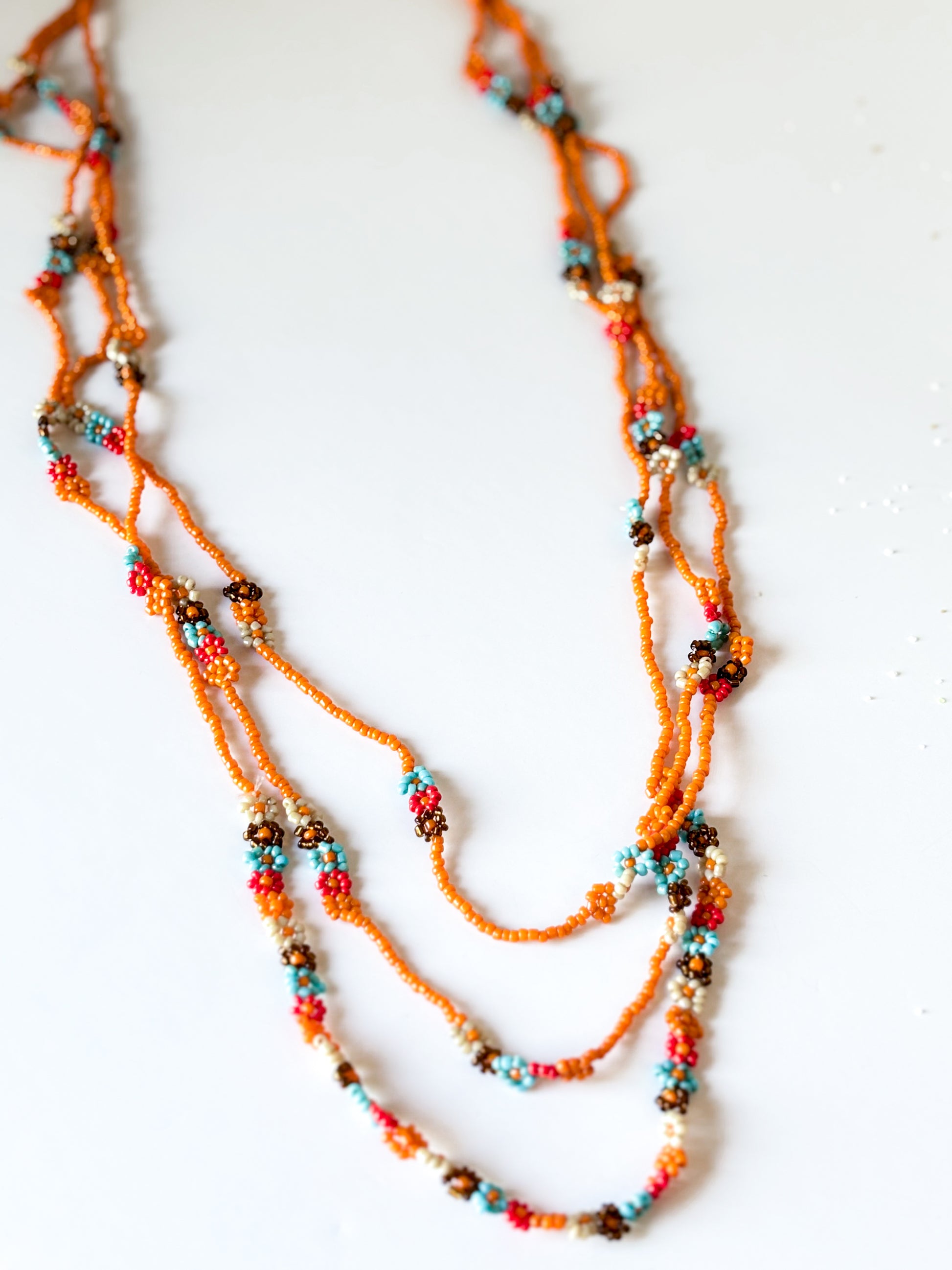 Colar comprido, todo trabalhado em missangas com detalhes de flores